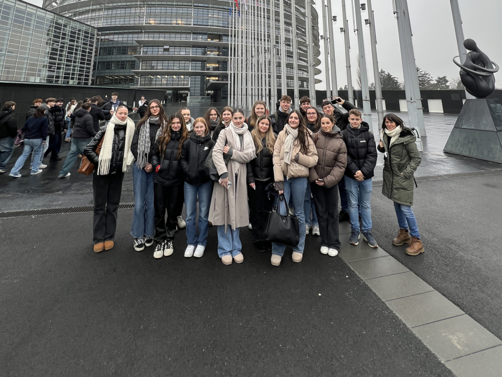 Am 21. Januar 2025 besuchte die Klasse WGI 12-3 gemeinsam mit Ihrer GGk-Lehrerin Frau Labriga das Europäische Parlament in Straßburg. Nach einem Vortrag eines Referenten des Besucherdienstes über die Rolle der EU im sog. „pazifischen“ Jahrhundert und die allgemeine Bedeutung der EU war der zweite Programmpunkt einer der beiden Höhepunkte des Besuchs: Eine halbe Stunde lang konnten die Schülerinnen und Schüler bei der angeregten Debatte im Plenarsaal zuhören. Die Abgeordneten führten eine Debatte über den Digital Services Act. Die Schüler und Schülerinnen fanden es sehr spannend mit zu verfolgen, wie engagiert und leidenschaftlich die Abgeordneten diskutierten. Einige Schüler und Schülerinnen äußerten Bedauern darüber, dass sie nicht noch länger zuhören und auch die Abstimmung nicht mehr ansehen konnten (alle Zuhörer und Zuhörerinnen dürfen immer nur eine halbe Stunde auf der Tribüne bleiben).
