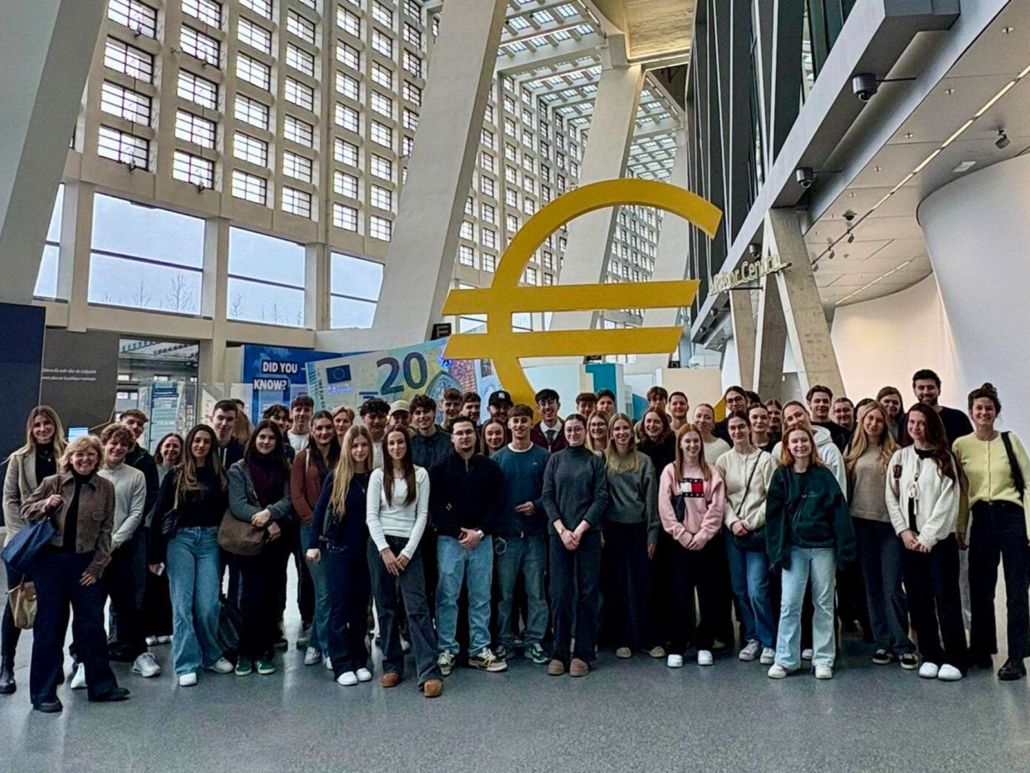 Am Freitagmorgen starteten wir mit einem entspannten Spaziergang am Main Richtung Europäische Zentralbank (EZB). Die beeindruckende Skyline sorgte schon für das passende Finanzmetropolen-Feeling. Nach einer Sicherheitskontrolle, die man sonst nur vom Flughafen kennt, betraten wir die heiligen Hallen der europäischen Geldpolitik. In der EZB erhielten wir eine spannende Führung durch die Ausstellung zu den Aufgaben der EZB, Mitglieder des EZB-Rat, Bankenaufsicht sowie zur Planung des digitalen Euros. Ein besonderes Highlight war der Videoraum, in dem wir uns wie Frau Lagarde fühlen durften und virtuell an einer Sitzung des EZB-Rates teilnahmen – ganz nah dran an den Entscheidungen, die Europas Wirtschaft beeinflussen.